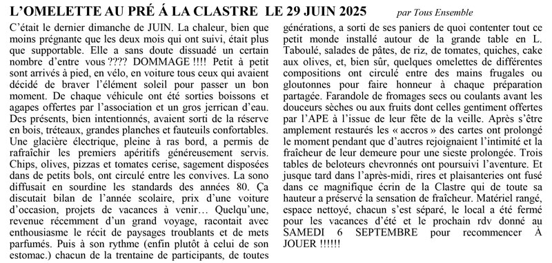 L'OMELETTE AU PRE A LA CLASTRE LE 29 JUIN 2025 Lire Tous Ensemble